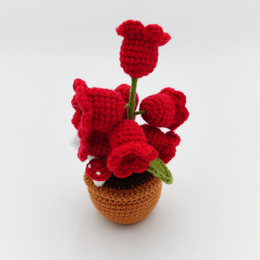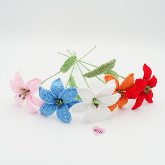 Handmade Crochet Lily Set (5 Pieces) Flowers with Leave and Long Stem, Assorted Colors (Red Orange Pink Blue White)